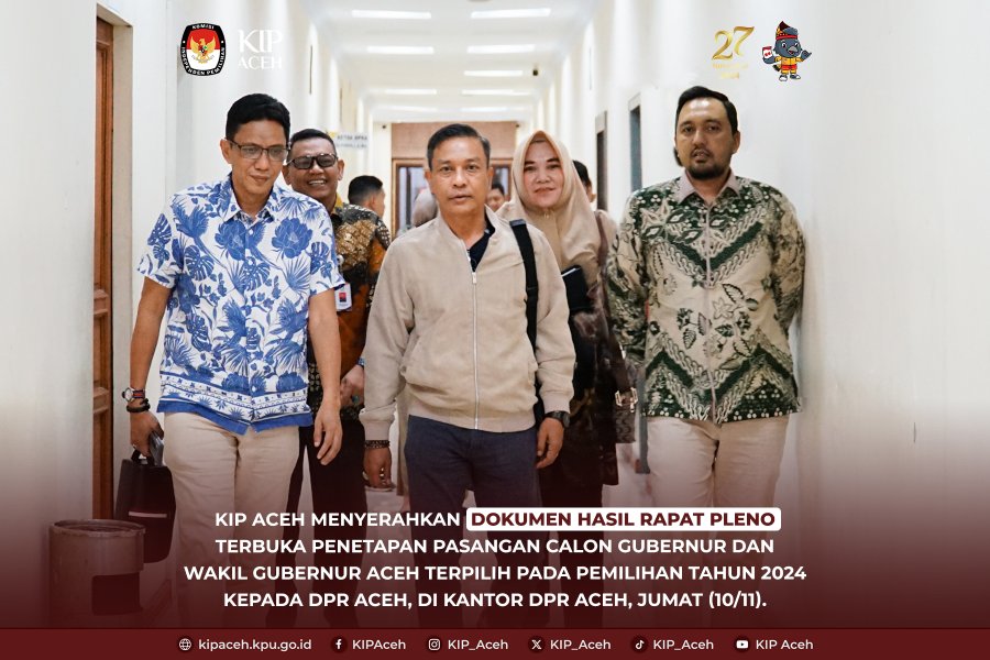KIP Aceh secara resmi menyerahkan dokumen hasil Rapat Pleno Terbuka Penetapan Pasangan Calon Gubernur dan Wakil Gubernur Aceh Terpilih pada Pemilihan Tahun 2024 kepada DPR Aceh.