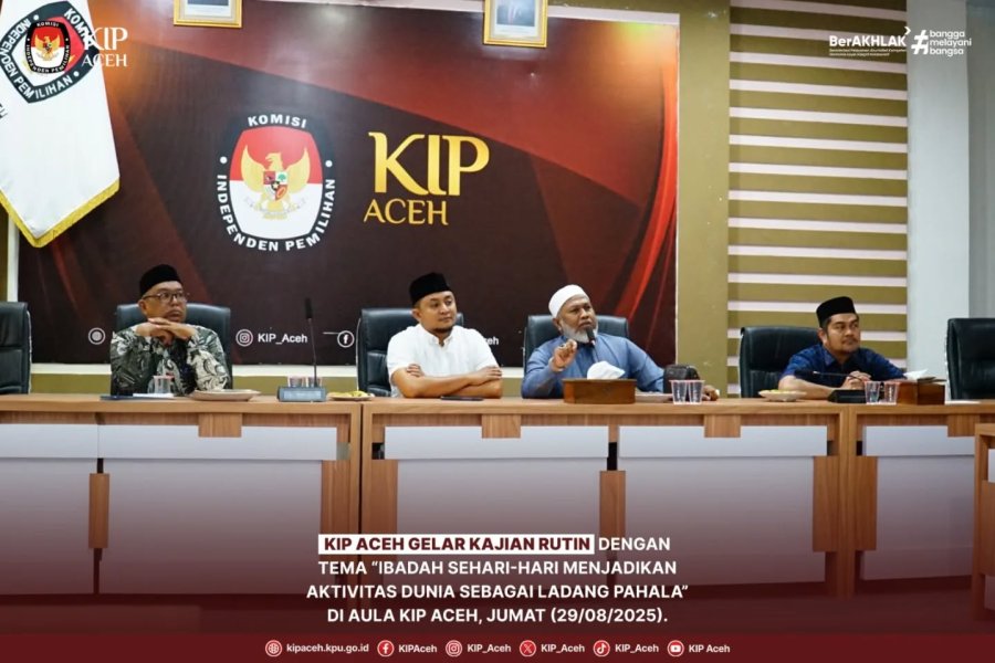 Saleum #TemanPemilih Komisi Independen Pemilihan (KIP) Aceh menggelar kajian rutin di Aula KIP Aceh pada Jumat (29/08/2025). Kegiatan ini mengusung tema “Ibadah Sehari-hari Menjadikan Aktivitas Dunia Sebagai Ladang Pahala”.
