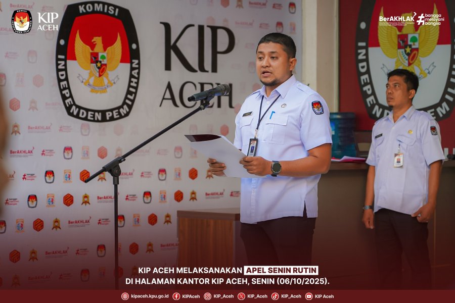 Saleum #TemanPemilih Komisi Independen Pemilihan (KIP) Aceh melaksanakan apel Senin rutin di halaman kantor KIP Aceh pada Senin pagi (06/10/2025). Apel ini dipimpin oleh Plt. Sekretaris KIP Aceh, T. Joan Virgianshah.