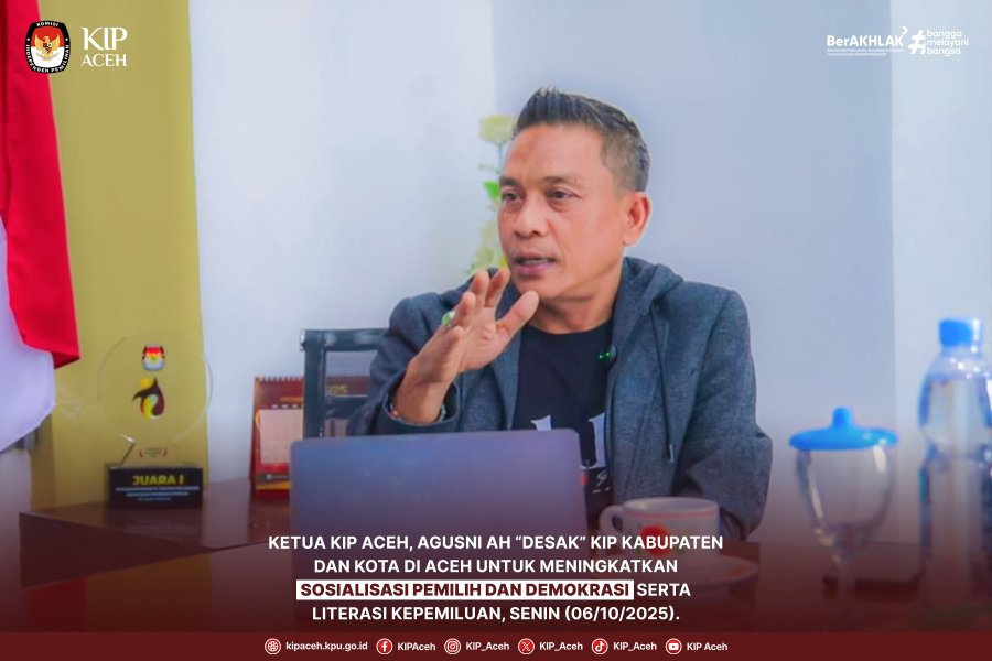Saleum #TemanPemilih Ketua Komisi Independen Pemilihan (KIP) Provinsi Aceh, Agusni AH "desak" KIP Kabupaten dan Kota di Aceh untuk meningkatkan sosialisasi pemilih dan demokrasi serta literasi kepemiluan ditengah waktu senggang masa non tahapan. Hal ini disampaikan Agusni dalam Podcast KIP Aceh Tamiang, yang dipandu oleh Mauliza Wira Kesuma, Komisioner KIP Aceh Tamiang, pada Senin (7/10/2025).