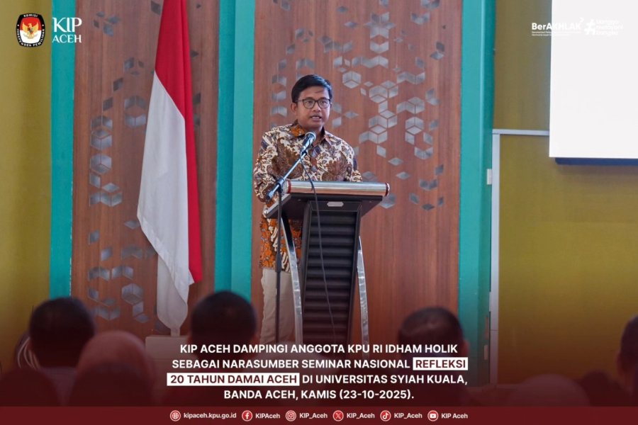 Komisi Independen Pemilihan (KIP) Aceh mendampingi Anggota Komisi Pemilihan Umum (KPU) Republik Indonesia, Idham Holik, yang menjadi narasumber dalam Seminar Nasional Refleksi 20 Tahun Damai Aceh di Universitas Syiah Kuala, Banda Aceh, Kamis (23/10/2025).
