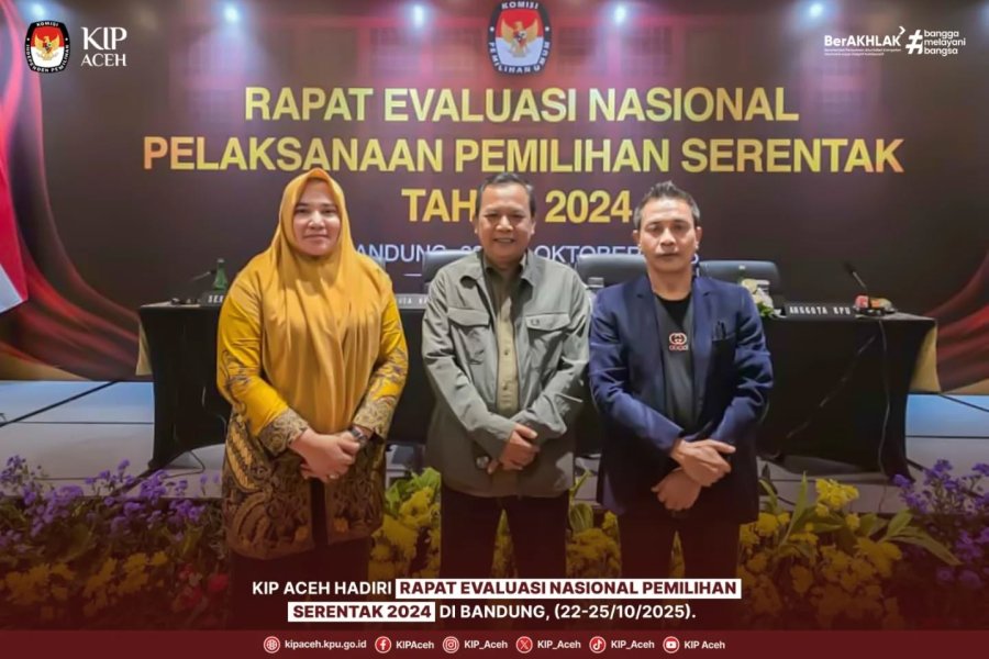 Komisi Independen Pemilihan (KIP) Aceh menghadiri Rapat Evaluasi Nasional Pelaksanaan Pemilihan Serentak Tahun 2024 yang dilaksanakan oleh KPU Republik Indonesia di Bandung pada 22–25 Oktober 2025.
