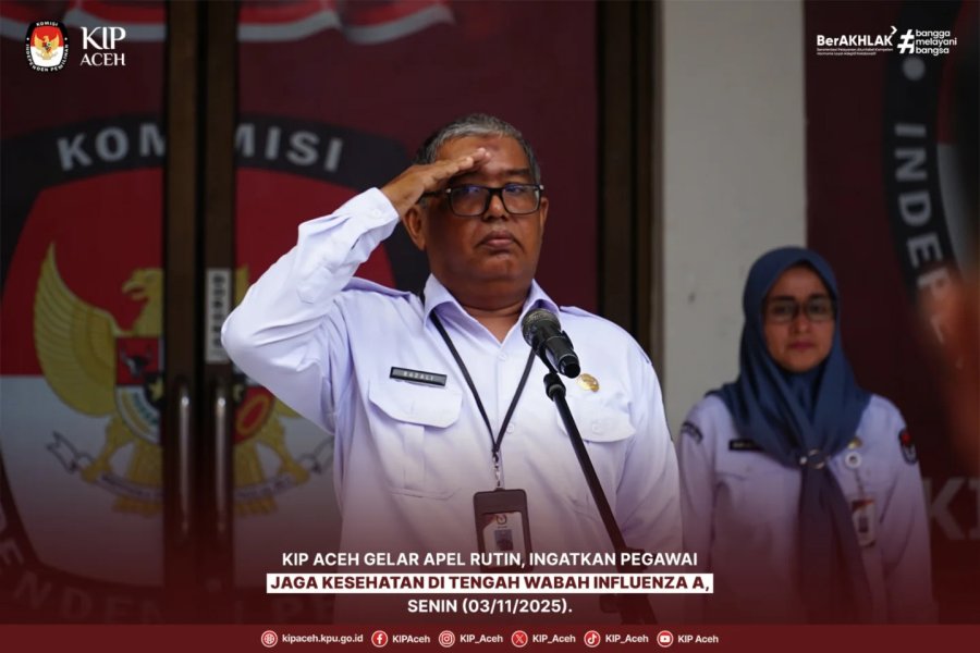 Saleum #TemanPemilih Komisi Independen Pemilihan (KIP) Aceh melaksanakan apel rutin di halaman kantor setempat, Senin (03/11/2025). Dalam kegiatan tersebut, PKP Ahli Madya KIP Aceh, Razali bertindak sebagai Pembina Apel, sementara Kepala Subbagian Umum dan Logistik, Turmizi bertugas sebagai Pemimpin Apel.