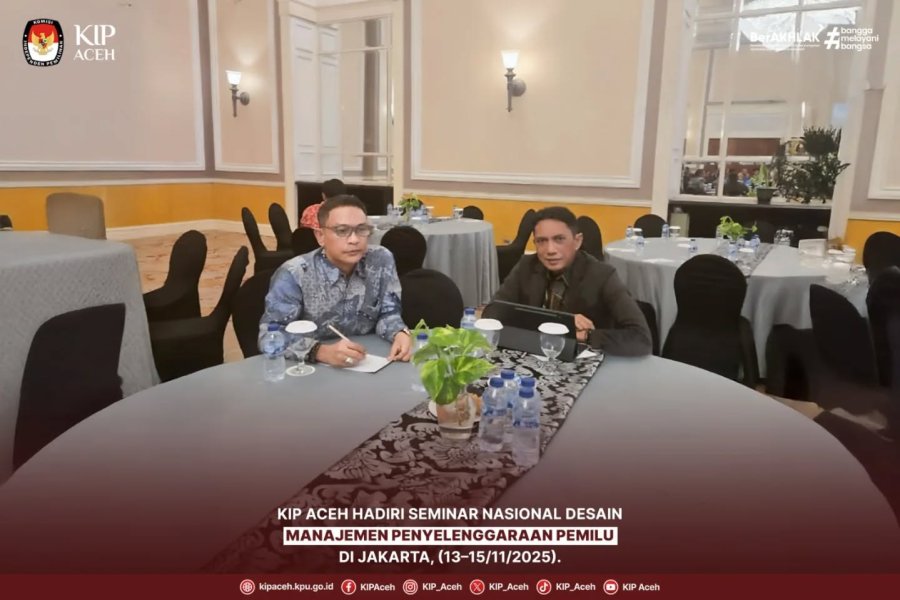 Saleum #TemanPemilih Ketua KIP Aceh, Agusni AH, bersama Wakil Ketua KIP Aceh, Iskandar Agani, mengikuti kegiatan Seminar Nasional bertema “Desain Manajemen Penyelenggaraan Pemilu/Pemilihan yang Lebih Inklusif, Partisipatif, dan Akuntabel: Diseminasi Hasil Forum Diskusi Terpumpun (FDT) Tematik untuk Wujudkan Masa Depan Pemilu/Pemilihan yang Lebih Berintegritas”. Kegiatan ini diselenggarakan oleh KPU RI pada 13–15 November 2025 di Jakarta.