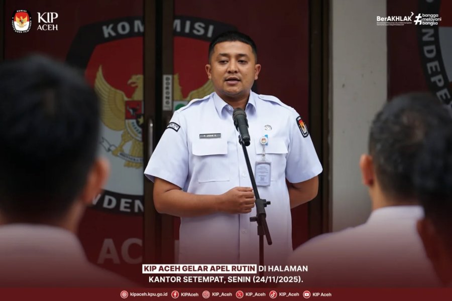Saleum #TemanPemilih Komisi Independen Pemilihan (KIP) Aceh menggelar apel rutin di halaman kantor setempat, Senin (24/11/2025). Bertindak sebagai Pembina Apel yaitu Sekretaris KIP Aceh, T. Joan Virgianshah, dengan Pimpinan Apel Kepala Subbagian Umum dan Logistik, Turmizi.