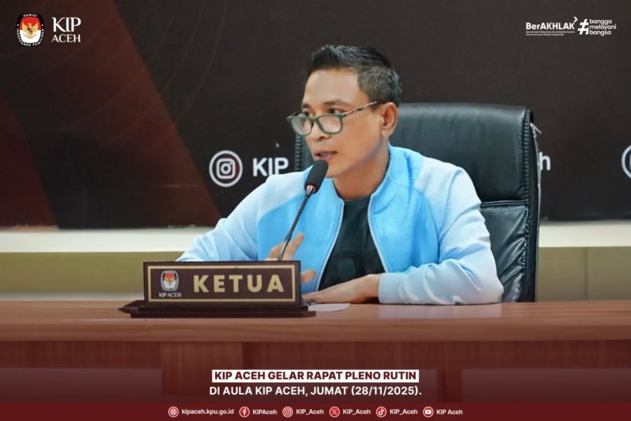 Saleum #TemanPemilih Komisi Independen Pemilihan (KIP) Aceh menggelar Rapat Pleno Rutin di Aula KIP Aceh pada Jumat (28/11/2025). Rapat dipimpin langsung oleh Ketua KIP Aceh, Agusni AH yang membuka sekaligus memimpin jalannya pleno. Ia didampingi oleh Ketua Divisi Perencanaan dan Logistik, Khairunnisak, Ketua Divisi Data dan Informasi, Muhammad Sayuni, Ketua Divisi Sumber Daya Manusia Penelitian dan Pengembangan, Saiful, Ketua Divisi Hukum dan Pengawasan, Ahmad Mirza Safwandy serta Sekretaris KIP Aceh, T. Joan Virgianshah.