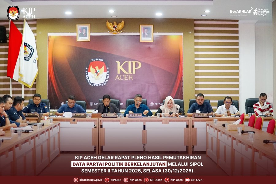 Saleum #TemanPemilih Komisi Independen Pemilihan (KIP) Aceh menggelar Rapat Pleno Hasil Pemutakhiran Data Partai Politik Berkelanjutan melalui Sistem Informasi Partai Politik (Sipol) Semester II Tahun 2025, yang berlangsung di Aula Kantor KIP Aceh, pada Selasa (30/12/2025).