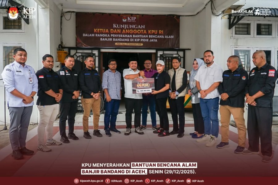 Bantuan kemanusiaan tersebut diserahkan langsung oleh Ketua KPU RI, Mochammad Afifuddin, berupa bantuan dana sebesar Rp800.000.000 (delapan ratus juta rupiah) yang diterima oleh Ketua KIP Aceh, Agusni AH, untuk selanjutnya disalurkan kepada seluruh daerah di Aceh yang terdampak bencana.