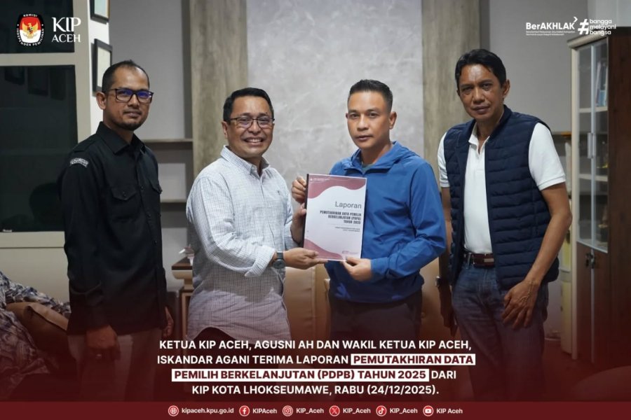 Saleum #TemanPemilih Ketua Komisi Independen Pemilihan Aceh, Agusni AH, bersama Wakil Ketua KIP Aceh, Iskandar Agani, menerima laporan Pemutakhiran Data Pemilih Berkelanjutan (PDPB) Tahun 2025 dari KIP Kota Lhokseumawe di Kantor KIP Aceh, Rabu (24/12/2025).