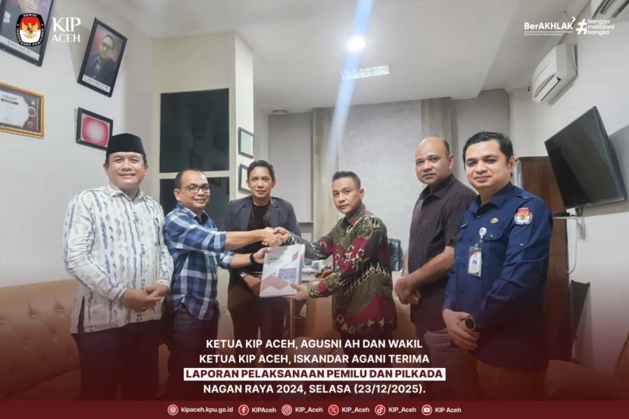 Saleum #TemanPemilih Ketua KIP Aceh, Agusni AH, bersama Wakil Ketua KIP Aceh, Iskandar Agani, menerima Laporan Pelaksanaan Pemilu serta Pelaksanaan Pilkada Nagan Raya Tahun 2024. Laporan tersebut diserahkan langsung oleh Ketua KIP Kabupaten Nagan Raya dengan didampingi Anggota dan Sekretaris pada Selasa (23/12/2025).