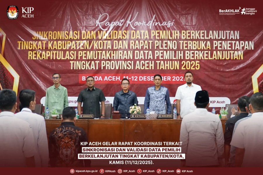 Saleum #TemanPemilih KIP Aceh menggelar rapat koordinasi terkait Sinkronisasi dan Validasi Data Pemilih Berkelanjutan Tingkat Kabupaten/Kota pada Kamis (11/12/2025). Kegiatan ini menjadi langkah strategis untuk memastikan kualitas dan ketepatan data pemilih yang terus diperbarui secara berkelanjutan.