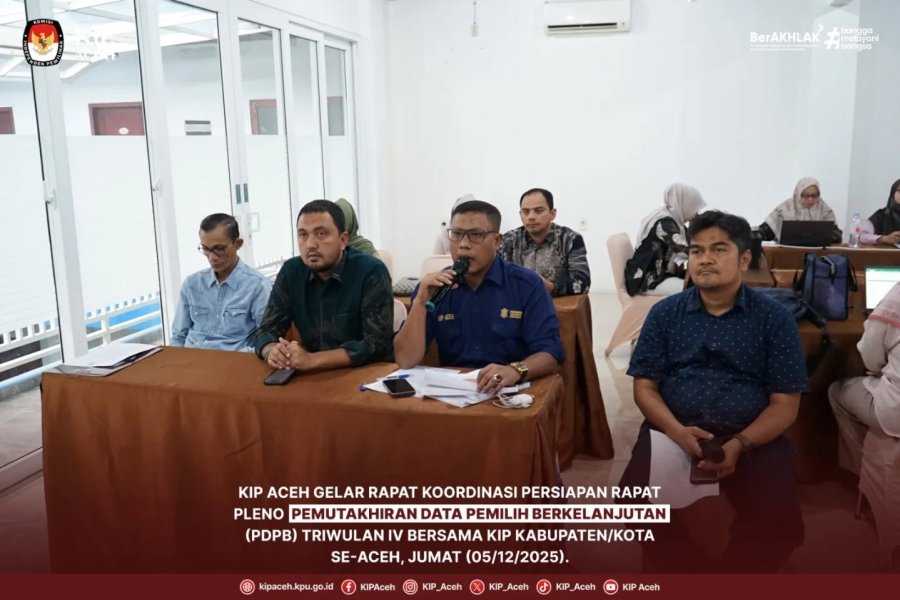 Saleum #TemanPemilih KIP Aceh menggelar Rapat Koordinasi Persiapan Rapat Pleno Pemutakhiran Data Pemilih Berkelanjutan (PDPB) Triwulan IV bersama KIP Kabupaten/Kota se-Aceh, Jumat (05/12/2025). Kegiatan ini dilaksanakan sebagai bentuk dalam persiapan pleno rekapitulasi pemutakhiran data pemilih berkelanjutan triwulan IV Tahun 2025 di tingkat kip kabupaten/kota yang akan dilaksanakan pada tanggal 6 s.d 8 Desember 2025 di wilayah masing-masing satker