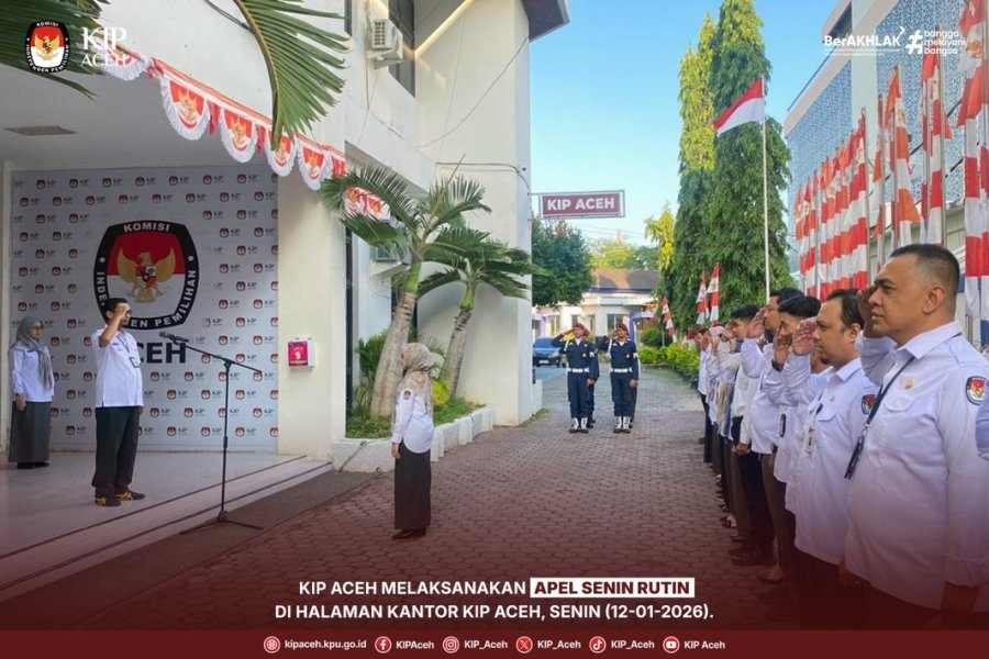 Komisi Independen Pemilihan (KIP) Aceh melaksanakan apel Senin rutin di halaman kantor KIP Aceh pada Senin pagi (12/01/2026). Apel ini dipimpin oleh Kepala Bagian Teknis Penyelenggaraan Pemilu, Partisipasi, Hubungan Masyarakat, Hukum, dan SDM, Fahmi.