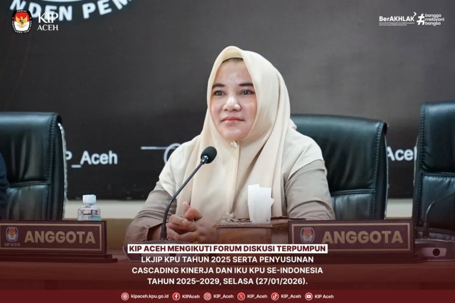 KIP Aceh mengikuti Forum Diskusi Terpumpun (FDT) Penyusunan Laporan Kinerja Instansi Pemerintah (LKjIP) KPU Tahun 2025 serta Penyusunan Cascading Kinerja dan Indikator Kinerja Utama (IKU) KPU, KPU Provinsi, dan KPU Kabupaten/Kota Tahun 2025–2029 yang dilaksanakan secara daring, Selasa (27/01/2026).