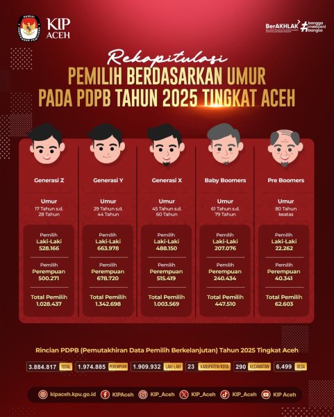 Berikut Rekapitulasi Pemilih Berdasarkan Umur pada Pemutakhiran Data Pemilih Berkelanjutan (PDPB) Tahun 2025 Tingkat Aceh.