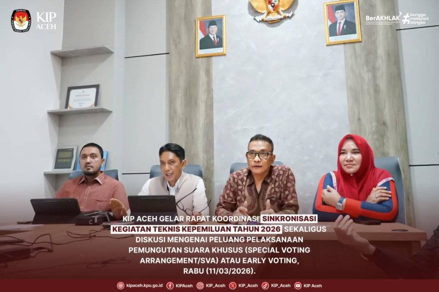 Saleum #TemanPemilih Komisi Independen Pemilihan (KIP) Aceh menggelar Rapat Koordinasi Sinkronisasi Kegiatan Teknis Kepemiluan Tahun 2026 sekaligus diskusi mengenai peluang pelaksanaan Pemungutan Suara Khusus (Special Voting Arrangement/SVA) atau Early Voting, Rabu (11/03/2026).