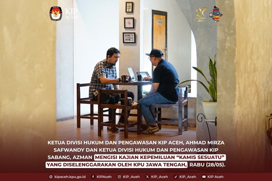 Saleum #TemanPemilih Ketua Divisi Hukum dan Pengawasan KIP Aceh, Ahmad Mirza Safwandy, bersama Ketua Divisi Hukum dan Pengawasan KIP Sabang menjadi pembicara dalam program"Kamis Sesuatu", sebuah kajian hukum rutin kepemiluan KPU Provinsi Jawa Tengah, pada Rabu (28/05).