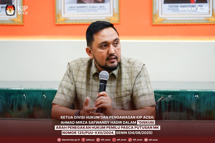 Saleum #TemanPemilih Ketua Divisi Hukum dan Pengawasan KIP Aceh, Ahmad Mirza Safwandy menghadiri Rapat Persiapan Penguatan Kelembagaan dengan tema, "Diskusi Arah Penegakan Hukum Pemilu Pasca Putusan Mahkamah Konstitusi Nomor 135/PUU-XXII/2024, Senin (04/08) di Kantor Panwaslih Provinsi Aceh, Lueng Bata, Banda Aceh.