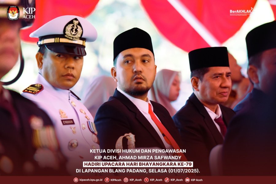 Saleum #TemanPemilih Ketua Divisi Hukum dan Pengawasan Komisi Independen Pemilihan (KIP) Aceh, Ahmad Mirza Safwandy, menghadiri upacara peringatan Hari Bhayangkara ke-79 yang digelar di Lapangan Blang Padang, Kota Banda Aceh, Selasa (01/07/2025).