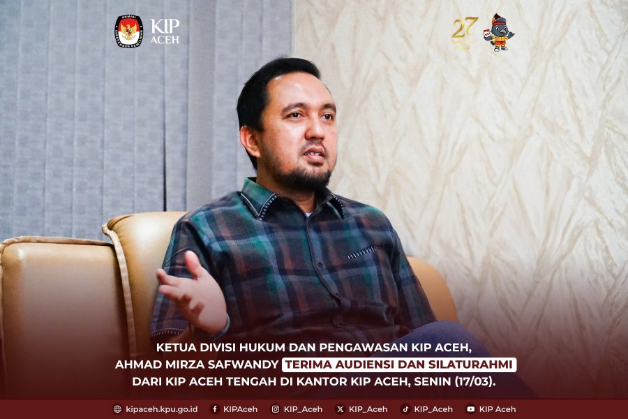 Saleum #TemanPemilih Ketua Divisi Hukum dan Pengawasan Komisi Independen Pemilihan (KIP) Aceh, Ahmad Mirza Safwandy, menerima audiensi dan silaturahmi dari rombongan KIP Aceh Tengah di Kantor KIP Aceh pada Senin (17/03).