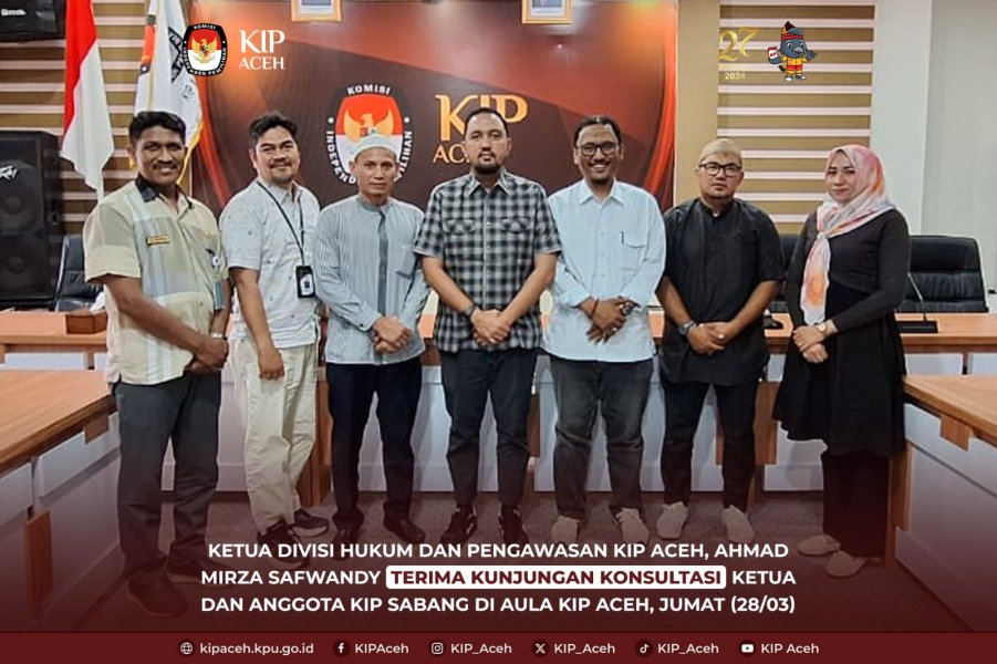 Saleum #TemanPemilih Ketua Divisi Hukum dan Pengawasan Komisi Independen Pemilihan (KIP) Aceh, Ahmad Mirza Safwandy didampingi Kabag Perencanaan, Data dan Informasi KIP Aceh, Emil Wardana menerima konsultasi Ketua dan Anggota KIP Sabang, Jumat (28/03) di Aula Kantor KIP Aceh, Banda Aceh.