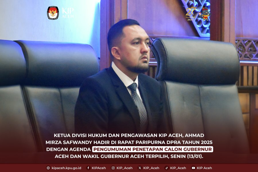 Saleum #TemanPemilih Ketua Divisi Hukum dan Pengawasan Komisi Independen Pemilihan (KIP) Aceh, Ahmad Mirza Safwandy, menghadiri Rapat Paripurna Dewan Perwakilan Rakyat Aceh (DPRA) pada Senin (13/01). Rapat ini digelar dengan agenda pengumuman penetapan calon Gubernur dan Wakil Gubernur Aceh terpilih tahun 2025.