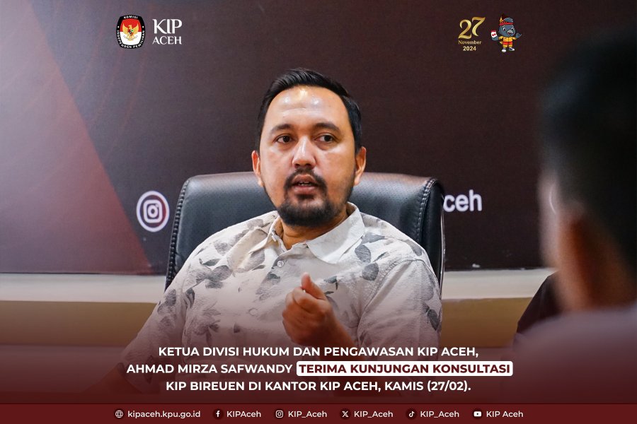 Saleum #TemanPemilih Ketua Divisi Hukum dan Pengawasan Komisi Independen Pemilihan (KIP) Aceh, Ahmad Mirza Safwandy, menerima kunjungan konsultasi dari KIP Kabupaten Bireuen di kantor KIP Aceh pada Kamis (27/02).