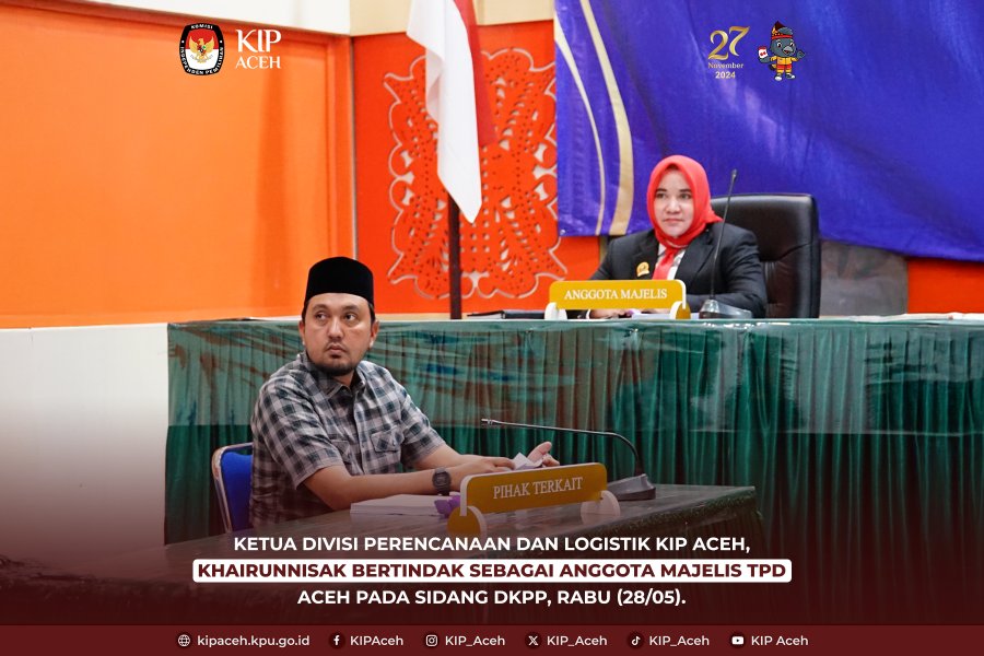 Saleum #TemanPemilih Ketua Divisi Perencanaan dan Logistik Komisi Independen Pemilihan (KIP) Aceh, Khairunnisak, ditunjuk sebagai Anggota Majelis Tim Pemeriksa Daerah (TPD) Provinsi Aceh dalam persidangan Dewan Kehormatan Penyelenggara Pemilu (DKPP), Rabu (28/05).