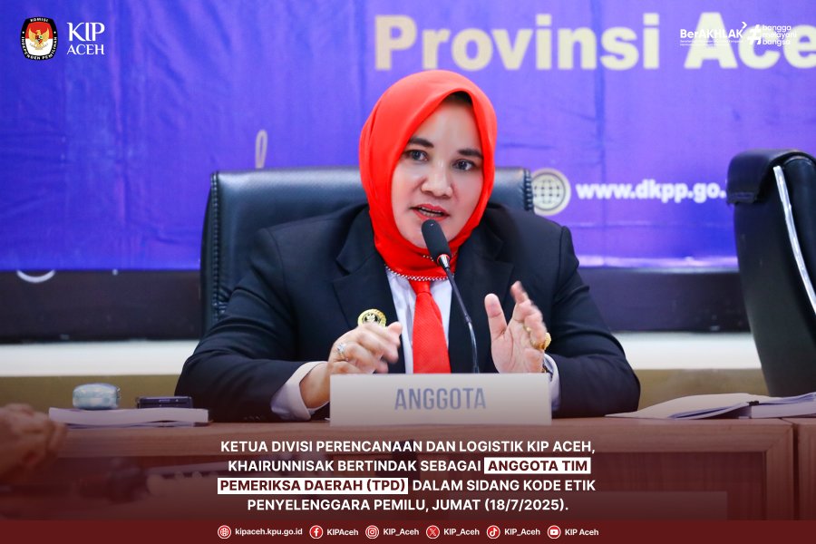 Ketua Divisi Perencanaan dan Logistik KIP Aceh, Khairunnisak, menjalankan tugas sebagai Anggota Tim Pemeriksa Daerah (TPD) unsur KIP Aceh dalam sidang dugaan pelanggaran Kode Etik Penyelenggara Pemilu (KEPP) dengan Nomor Perkara: 158-PKE-DKPP/VI/2025. Sidang ini digelar di Kantor KIP Aceh pada Jumat (18/7/2025).
