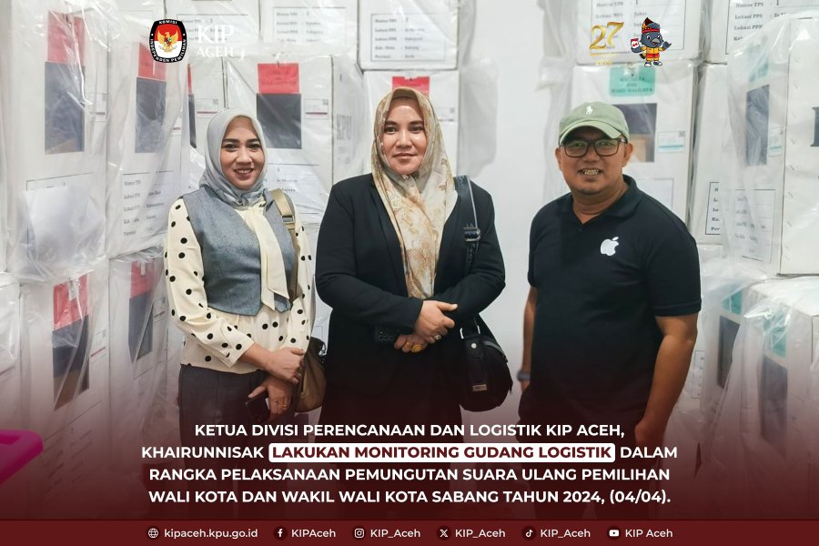Saleum #TemanPemilih Ketua Divisi Perencanaan dan Logistik Komisi Independen Pemilihan (KIP) Aceh, Khairunnisak, melakukan monitoring ke gudang logistik KIP Kota Sabang dalam rangka persiapan pelaksanaan Pemungutan Suara Ulang (PSU) Pemilihan Wali Kota dan Wakil Wali Kota Sabang Tahun 2024.