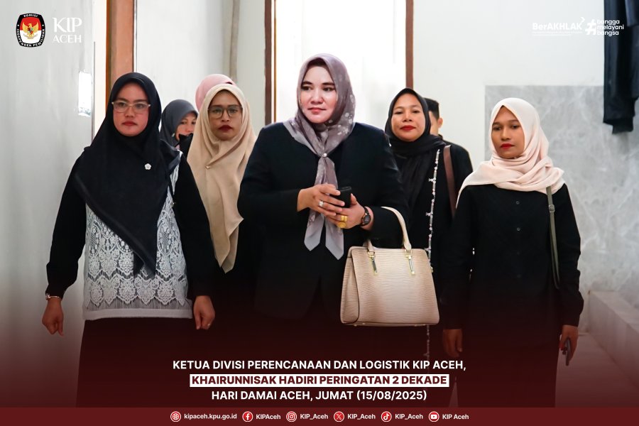 Saleum #TemanPemilih Ketua Divisi Perencanaan dan Logistik Komisi Independen Pemilihan (KIP) Aceh, Khairunnisak, menghadiri Peringatan 2 Dekade Hari Damai Aceh yang digelar di Gedung Balee Meuseuraya Aceh, Jumat (15/08/2025).