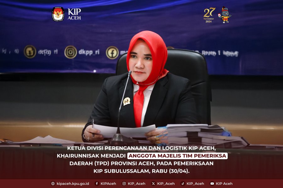 Saleum #TemanPemilih Ketua Divisi Perencanaan dan Logistik Komisi Independen Pemilihan (KIP) Aceh, Khairunnisak, sebagai anggota Majelis Tim Pemeriksa Daerah (TPD) Provinsi Aceh dalam sidang pemeriksaan dugaan pelanggaran kode etik penyelenggara Pemilu Perkara Nomor 282-PKE-DKPP/XI/2024 dan 304-PKE-DKPP/XII/2024, Rabu (30/04/2025).