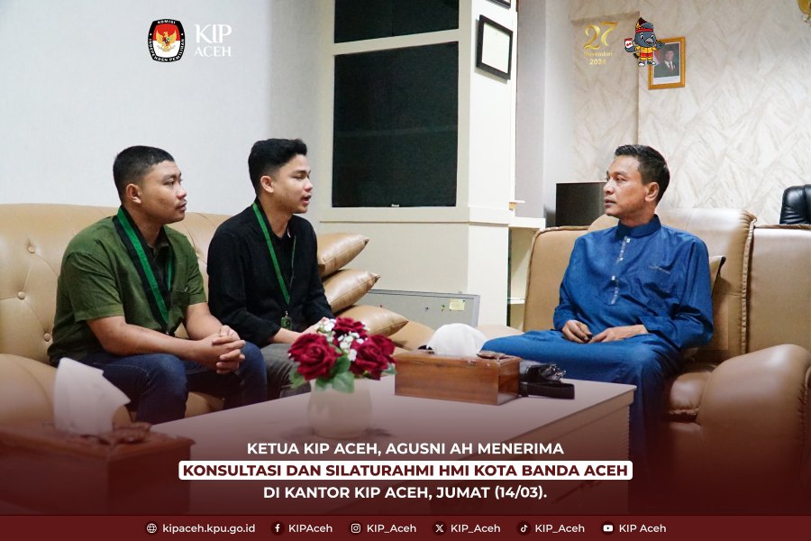 Saleum #TemanPemilih Ketua Komisi Independen Pemilihan (KIP) Aceh, Agusni AH didampingi oleh Sekretaris KIP Aceh, Muchtaruddin dan PKP Ahli Madya KIP Aceh, Nur Azizah menerima kunjungan konsultasi dan silaturahmi dari Himpunan Mahasiswa Islam (HMI) Cabang Kota Banda Aceh di Kantor KIP Aceh pada Jumat (14/03).