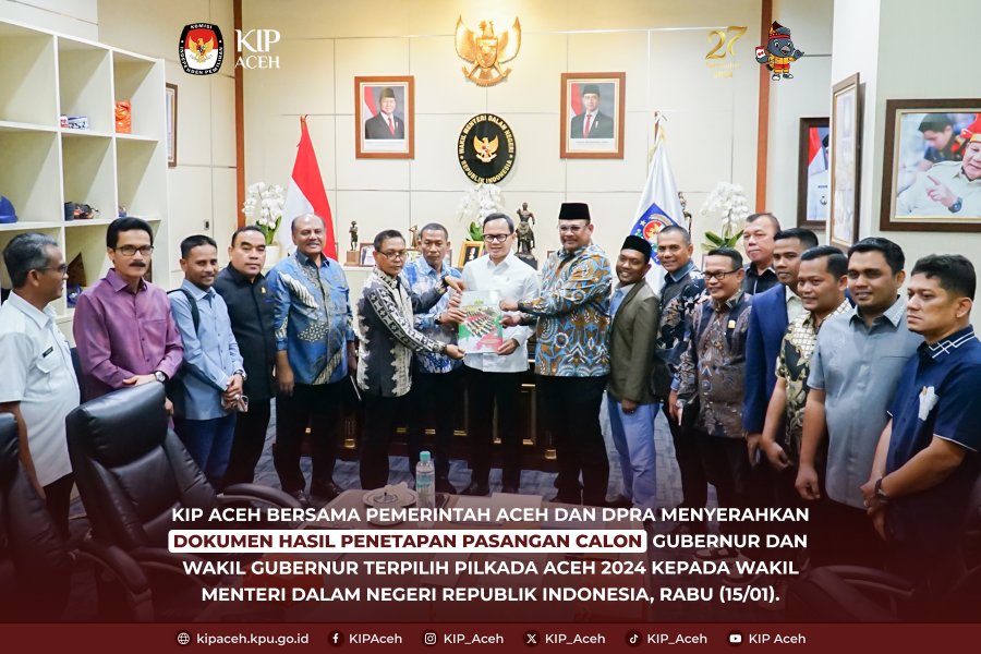 Saleum #TemanPemilih Komisi Independen Pemilihan (KIP) Aceh bersama Pemerintah Aceh dan Dewan Perwakilan Rakyat Aceh (DPRA) menyerahkan dokumen hasil penetapan pasangan calon Gubernur dan Wakil Gubernur terpilih pada Pilkada Aceh 2024 kepada Wakil Menteri Dalam Negeri Republik Indonesia, Bima Arya Sugiarto, pada Rabu (15/01).
