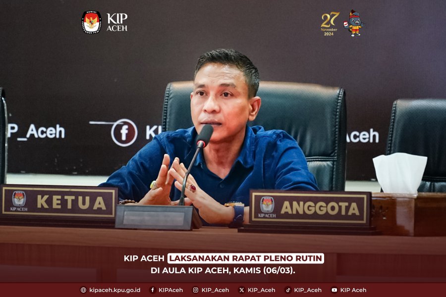 Saleum #TemanPemilih Komisi Independen Pemilihan (KIP) Aceh melaksanakan rapat pleno rutin di Aula KIP Aceh pada Kamis (06/03). Rapat pleno ini dipimpin langsung oleh Ketua KIP Aceh, Agusni AH, didampingi oleh Wakil Ketua KIP Aceh, Iskandar Agani, Ketua Divisi Data dan Informasi KIP Aceh, Muhammad Sayuni, Ketua Divisi Hukum dan Pengawasan KIP Aceh, Ahmad Mirza Safwandy, Ketua Divisi Sumber Daya Manusia, Penelitian, dan Pengembangan, Saiful, serta Sekretaris KIP Aceh, Muchtaruddin.