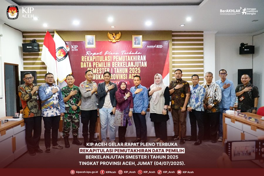 Saleum #TemanPemilih Komisi Independen Pemilihan (KIP) Aceh menggelar Rapat Pleno Terbuka Rekapitulasi Pemutakhiran Data Pemilih Berkelanjutan (PDPB) Semester I Tahun 2025 Tingkat Provinsi Aceh pada Jumat (04/07/2025). Kegiatan ini berlangsung di Aula KIP Aceh dan dihadiri oleh sejumlah perwakilan instansi strategis di Aceh.