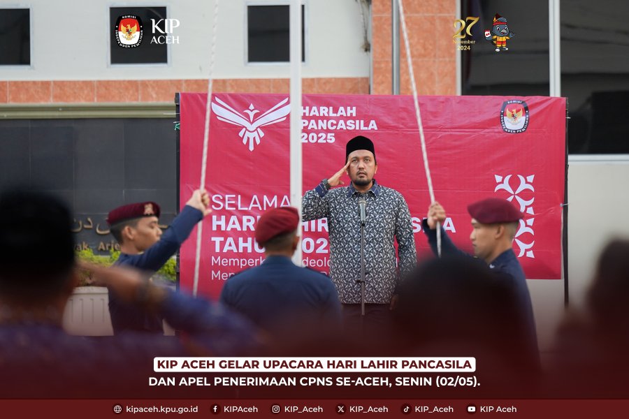 Saleum #TemanPemilih Komisi Independen Pemilihan (KIP) Aceh melaksanakan upacara peringatan Hari Lahir Pancasila Tahun 2025 yang dirangkaikan dengan apel penerimaan Calon Pegawai Negeri Sipil (CPNS) di lingkungan KIP se-Aceh. Kegiatan ini berlangsung di halaman Kantor KIP Aceh pada Senin (2/6/2025), dengan mengusung tema “Memperkokoh Ideologi Pancasila Menuju Indonesia Raya.”