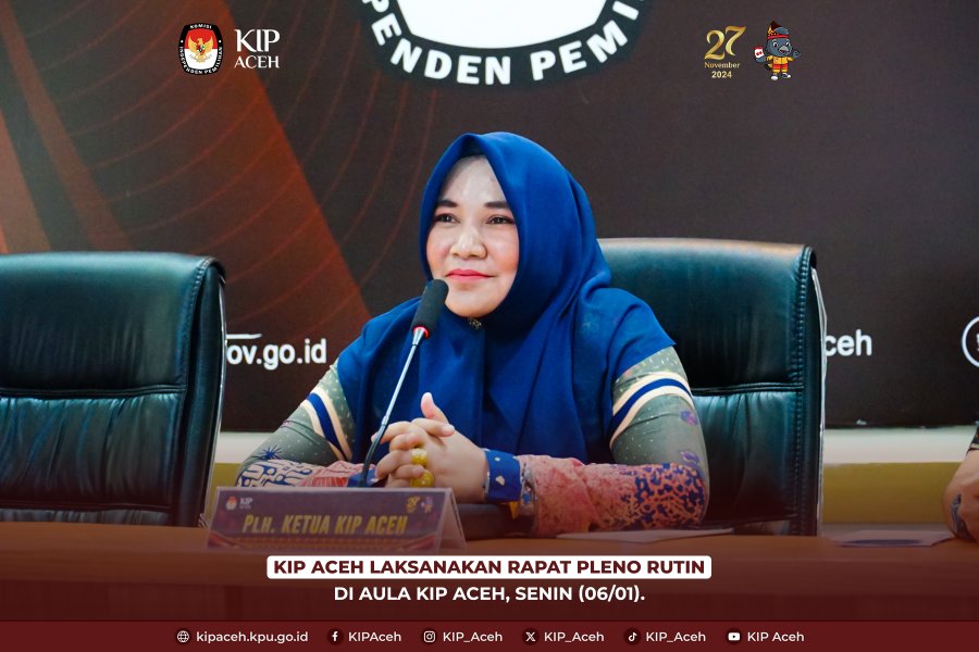 Saleum #TemanPemilih Komisi Independen Pemilihan (KIP) Aceh melaksanakan rapat pleno rutin di Aula KIP Aceh pada Senin (06/01). Rapat ini dipimpin oleh Plh. Ketua KIP Aceh, Khairunnisak, didampingi Ketua Divisi Hukum dan Pengawasan KIP Aceh, Ahmad Mirza Safwandy, Ketua Divisi Sumber Daya Manusia, Penelitian, dan Pengembangan, Saiful, serta Sekretaris KIP Aceh, Muchtaruddin.