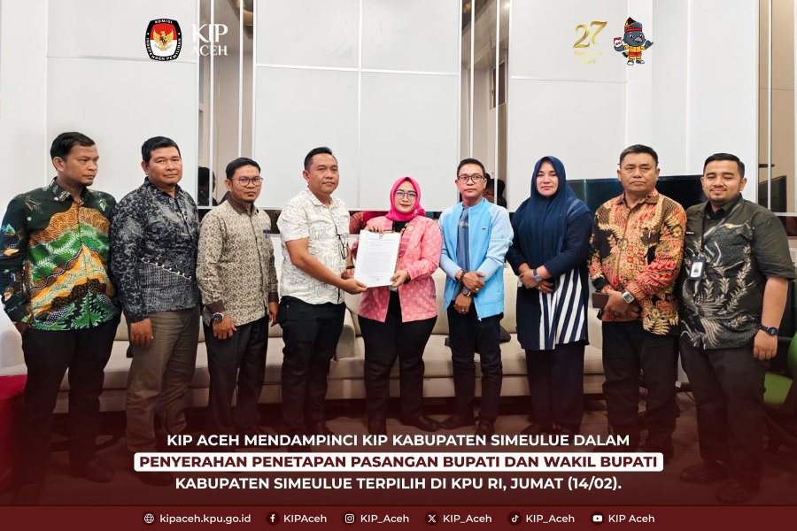 Saleum #TemanPemilih Komisi Independen Pemilihan (KIP) Aceh mendampingi KIP Kabupaten Simeulue dalam penyerahan dokumen penetapan pasangan bupati dan wakil bupati Kabupaten Simeulue terpilih ke Komisi Pemilihan Umum Republik Indonesia (KPU RI) pada Jumat (14/02).