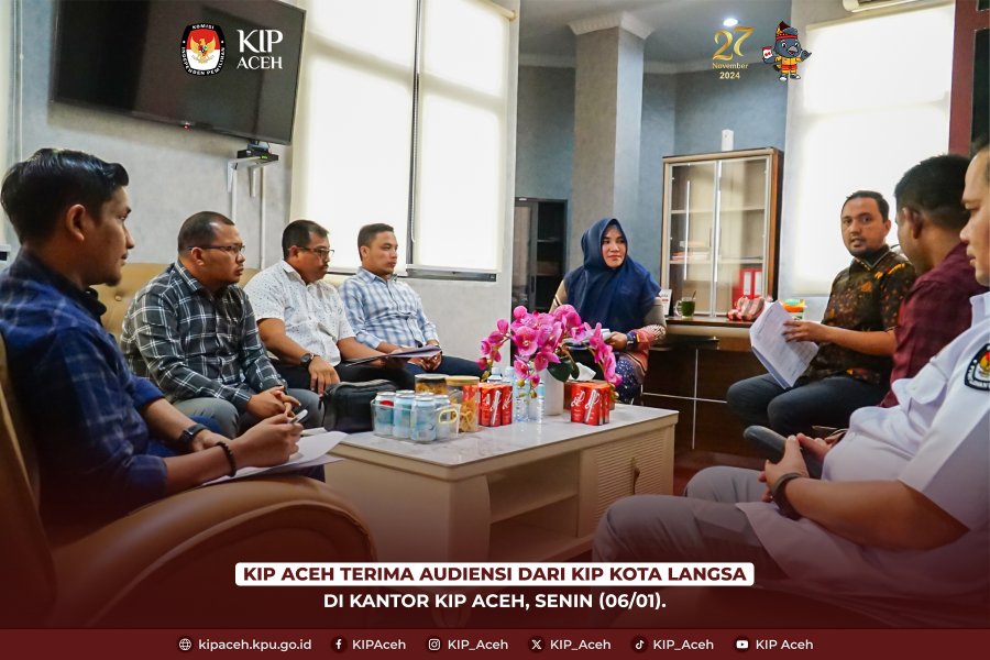 Saleum #TemanPemilih Komisi Independen Pemilihan (KIP) Aceh menerima kunjungan audiensi dari KIP Kota Langsa di kantor KIP Aceh pada Senin (06/01). Kunjungan ini diterima langsung oleh Plh. Ketua KIP Aceh, Khairunnisak, bersama Ketua Divisi Hukum dan Pengawasan KIP Aceh, Ahmad Mirza Safwandy.