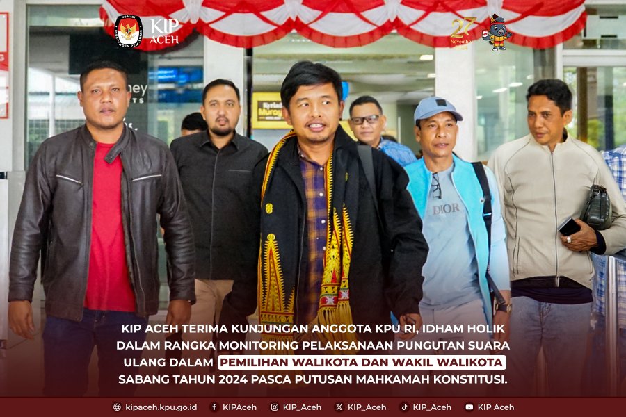 Saleum #TemanPemilih Komisi Independen Pemilihan (KIP) Aceh menerima kunjungan Ketua Divisi Teknis Penyelenggaraan Komisi Pemilihan Umum (KPU) RI, Idham Holik, dalam rangka monitoring pelaksanaan Pemungutan Suara Ulang (PSU) Pemilihan Wali Kota dan Wakil Wali Kota Sabang tahun 2024. Kunjungan ini dilakukan sebagai tindak lanjut atas putusan Mahkamah Konstitusi. Kegiatan berlangsung di Banda Aceh pada Jumat (4/4/2025).