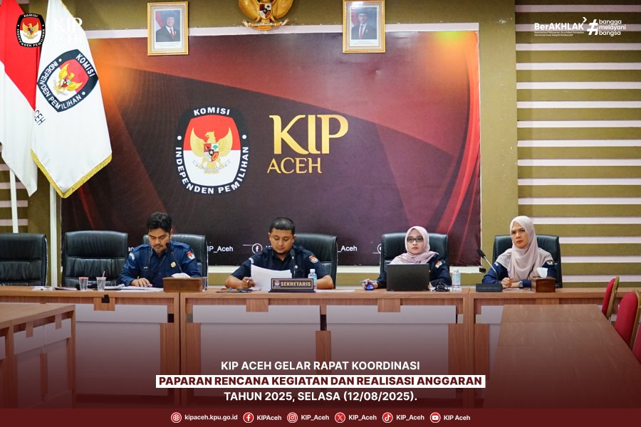 Saleum #TemanPemilih Komisi Independen Pemilihan (KIP) Aceh menggelar Rapat Koordinasi dalam rangka Paparan Rencana Kegiatan dan Realisasi Anggaran Tahun Anggaran 2025 bersama KIP Kabupaten/Kota se-Aceh, Selasa (12/08/2025).