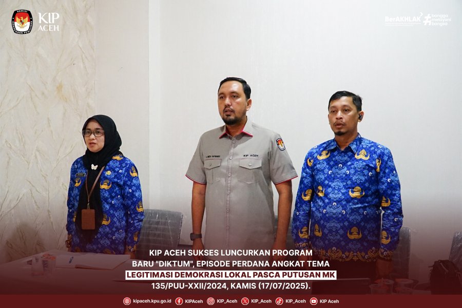 Saleum #TemanPemilih Komisi Independen Pemilihan (KIP) Aceh sukses meluncurkan program diskusi baru bertajuk,"DIKTUM_Dialektika Hukum". Melalui penyelenggaraan webinar perdana DIKTUM mengangkat tema “Legitimasi Demokrasi Lokal Pasca Putusan Mahkamah Konstitusi Nomor 135/PUU-XXII/2024”.