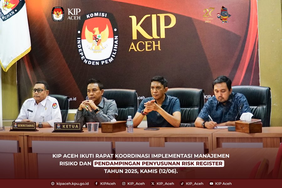 Saleum #TemanPemilih Komisi Independen Pemilihan (KIP) Aceh turut serta dalam Rapat Koordinasi Implementasi Manajemen Risiko dan Pendampingan Penyusunan Risk Register atau Daftar Risiko Tahun 2025 yang digelar secara hybrid oleh Komisi Pemilihan Umum (KPU) Republik Indonesia pada Kamis (12/06). Kegiatan ini diikuti oleh seluruh KPU se-Indonesia serta KIP se-Aceh.