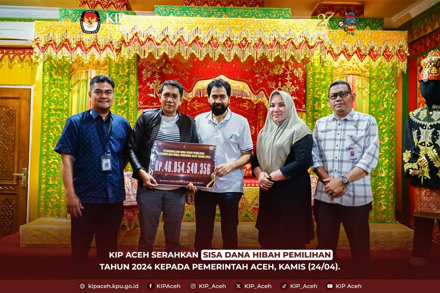 Saleum #TemanPemilih Komisi Independen Pemilihan (KIP) Aceh mengembalikan sisa dana hibah Pemilihan Tahun 2024 secara simbolis kepada Pemerintah Aceh, Kamis (24/04/2025) yang sebelumnya pengembalian ini sudah disetorkan terlebih dahulu ke Rekening Kas Umum Daerah (RKUD) Provinsi Aceh pada (09/04/2025). Kegiatan Penyerahan secara simbolis ini dilakukan di Gedung Meuligoe Gubenur Aceh, Banda Aceh.