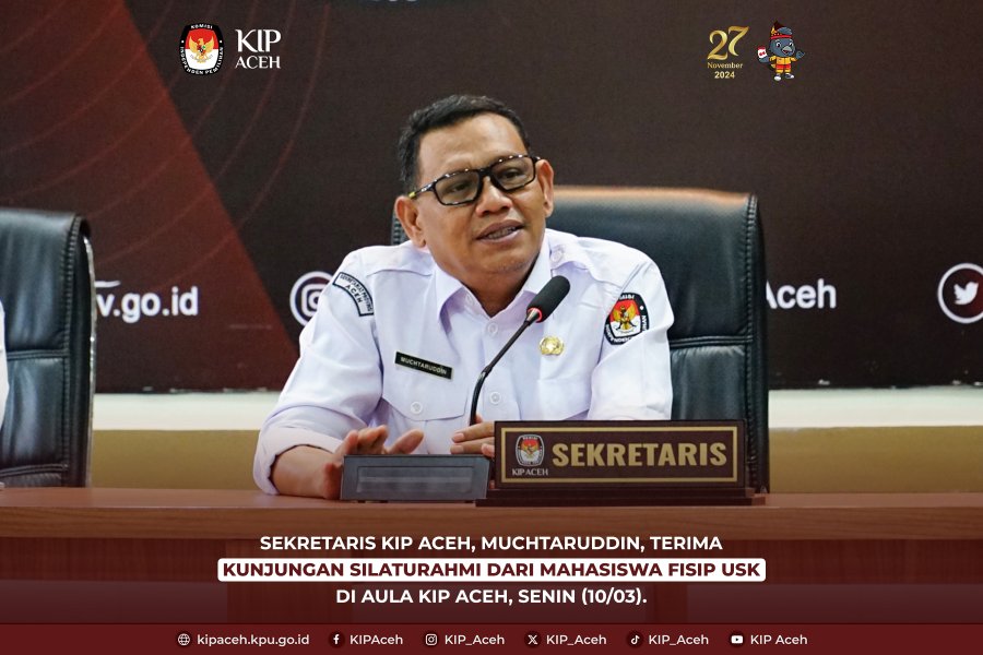 Saleum #TemanPemilih Sekretaris Komisi Independen Pemilihan (KIP) Aceh, Muchtaruddin, menerima kunjungan silaturahmi dari mahasiswa Fakultas Ilmu Sosial dan Ilmu Politik (FISIP) Universitas Syiah Kuala (USK) di Aula KIP Aceh pada Senin (10/03).